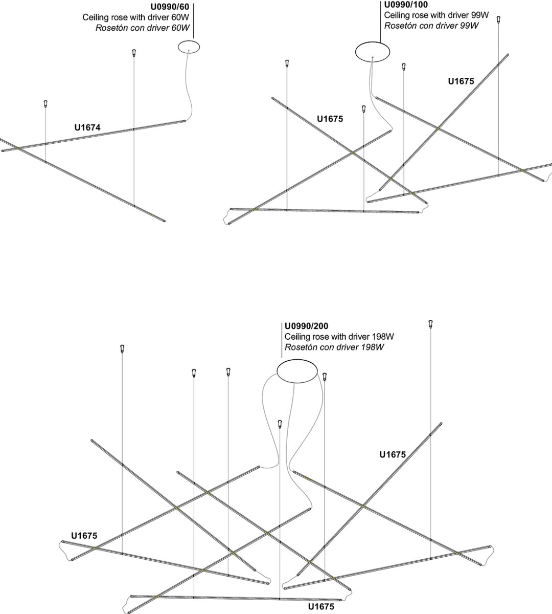Lampada a sospensione orientabile dal design essenziale caratterizzata da due/tre esili profili in alluminio nero e diffusore in policarbonato opalino.
