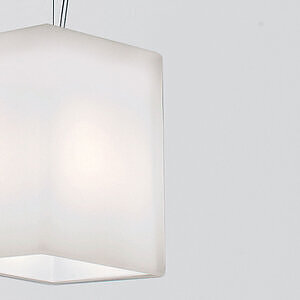 Lampada a sospensione a luce diffusa caratterizzata da un cubo in vetro stampato extra chiaro e verniciato di bianco, con portalampada con attacco G9, cavo di alimentazione trasparente e cavo di sospensione in acciaio.