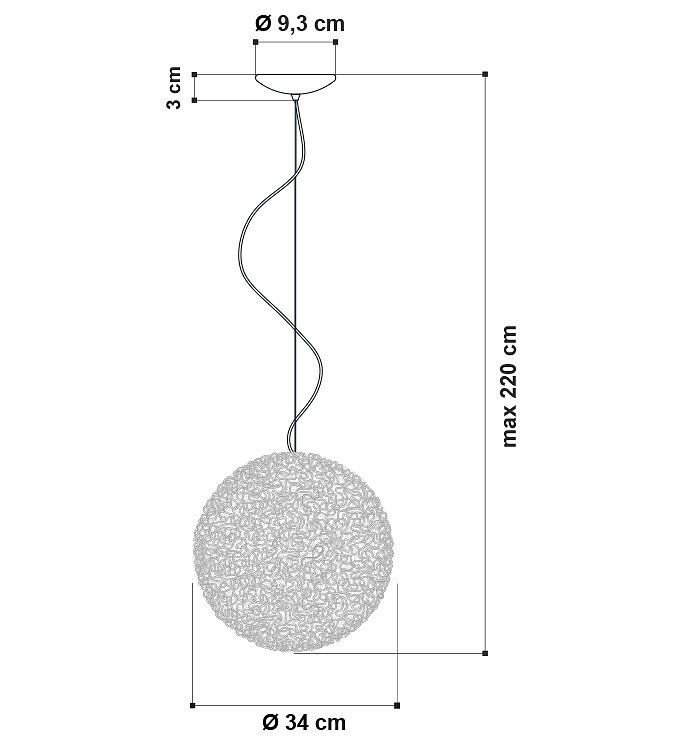 Hängeleuchte aus geflochtenem, überlappendem Methacrylat-Draht, mit einem mattweiß lackierten Metallrahmen, Lampenfassung mit E27-Fassung, Deckenbaldachin aus Polycarbonat und transparentem Stromkabel.