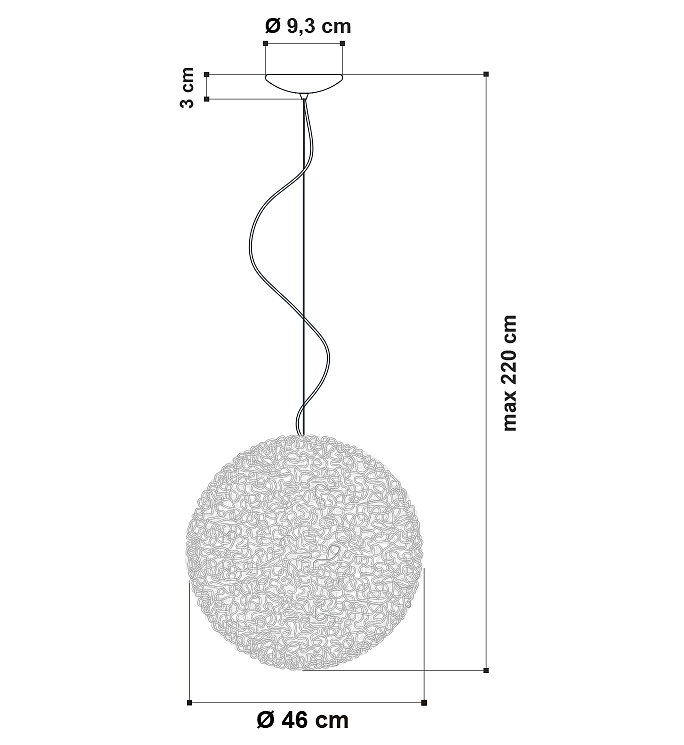 Hängeleuchte aus geflochtenem, überlappendem Methacrylat-Draht, mit einem mattweiß lackierten Metallrahmen, Lampenfassung mit E27-Fassung, Deckenbaldachin aus Polycarbonat und transparentem Stromkabel.