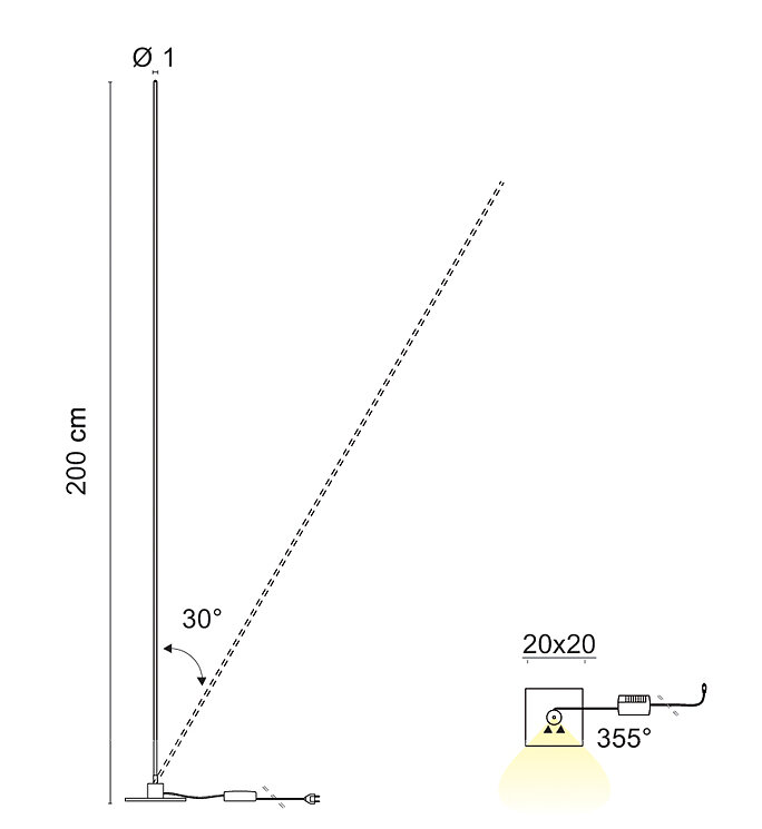 Verstellbare und dimmbare Stehleuchte mit diffusem Licht, die sich durch ein schlankes Designprofil aus schwarzem, stranggepresstem Aluminium, einen opalenen Polycarbonatdiffusor, einen Mikroschaltkreis mit 12,5 W/m und 203 LEDs/m mit CRI>90, einen Metallsockel und einen Kabeldimmer auszeichnet.