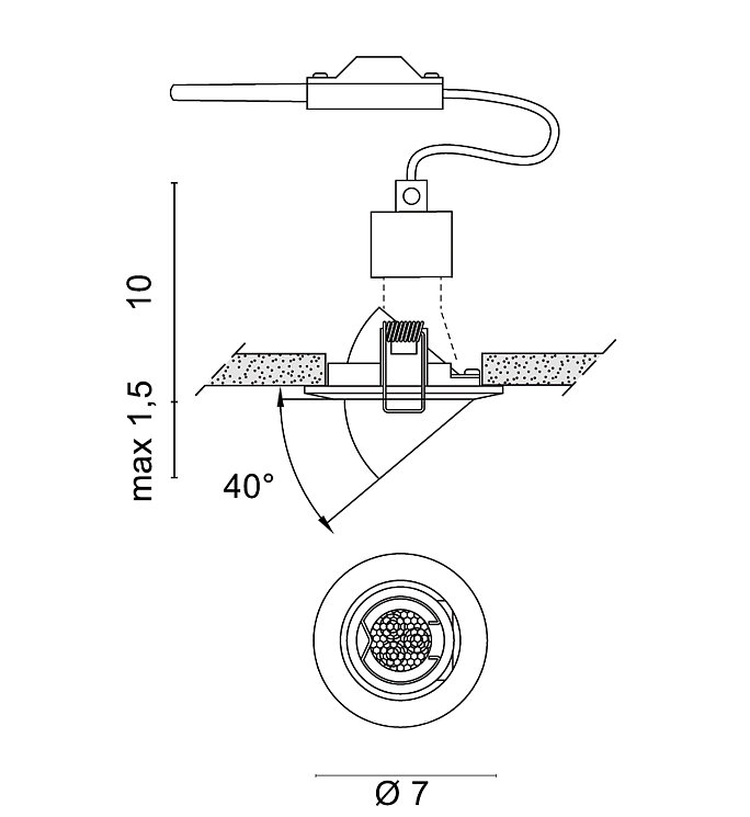 Kleiner verstellbarer Einbaustrahler für direktes Licht mit Struktur aus Aluminiumdruckguss und 35 mm GU10 Lampenfassung.