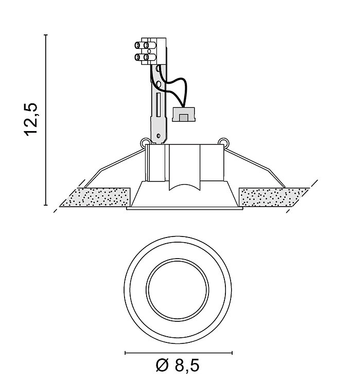 Mini-Einbaustrahler mit Aluminiumdruckgussgehäuse und sehr kleinem Flansch für den Einbau in Gipskartonzwischendecken.