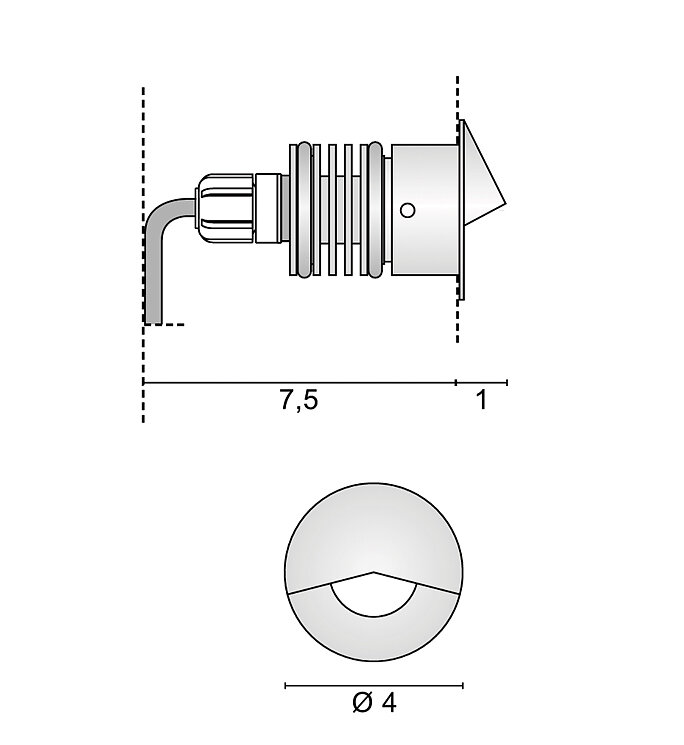 IP67 begehbares Downlight mit Flansch mit integrierter 500mA LED-Quelle, Blendschutzkappe aus Edelstahl AISI 316L, Aluminiumkühlkörper und 30 cm Neoprenkabel.