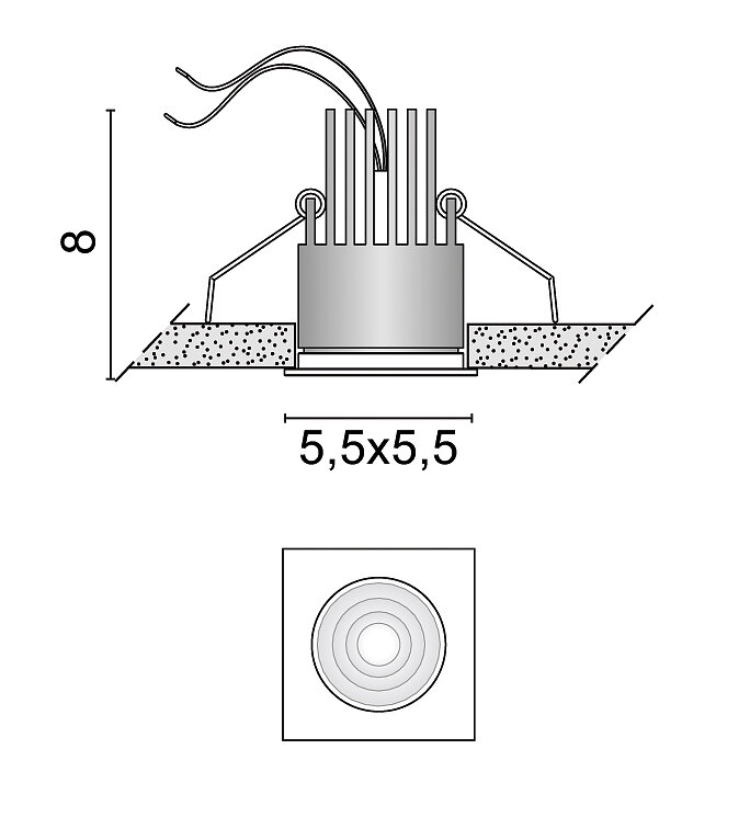 IP54-Einbaustrahler für Gipskartondecken mit integrierter 500mA-LED-Quelle, Aluminiumstruktur, 38° optischer Apertur und mit transparenter oder mattierter Glasfrontlinse erhältlich.