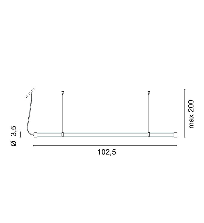 Pendelleuchte mit diffusem Licht und einer Länge von 102,5 cm mit einem Körper aus transparentem Methacrylat und Endkappen aus Aluminium.