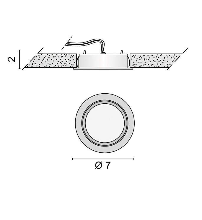 Einbaustrahler für Zwischendecken aus Gipskarton mit diffusem Licht mit 24V-LED-Quelle, Aluminiumstruktur und opaler Methacrylat-Diffusorscheibe.