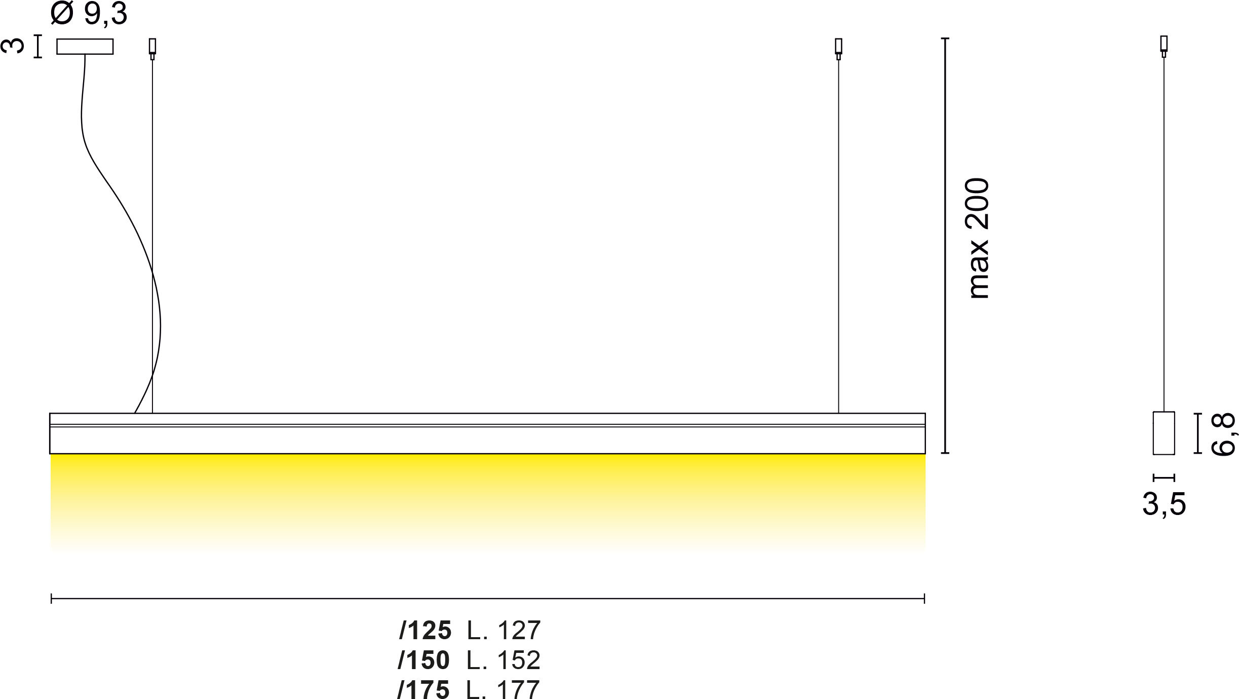 Linear direct-light suspension lamp with extruded aluminum body, sized to be able to hold power supplies, micro-primed methacrylate diffuser, ABS ceiling rose, 25W/m Down circuit and 15W/m Up circuit both with 180 LEDs/m and with CRI>90.
