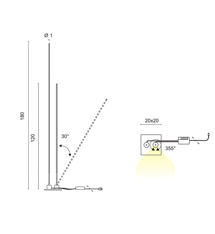 Lámpara de pie orientable y regulable que proporciona una luz difusa caracterizada por dos esbeltos perfiles de diseño en aluminio extruido negro, difusor de policarbonato opalino, microcircuito de 12,5W/m y 203 LED/m con CRI>90, base metálica y regulador de intensidad por cable.