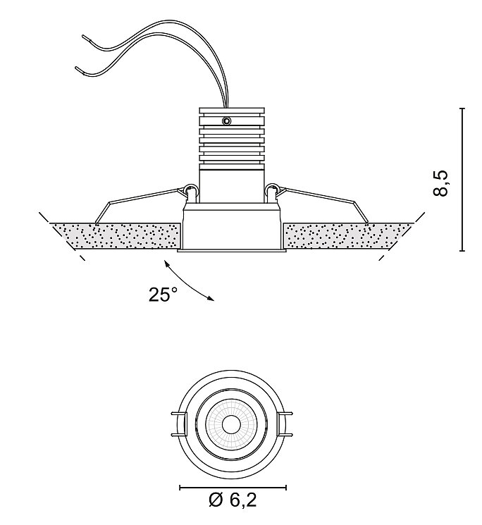 Mini foco empotrable regulable para iluminación de acento o difusa con fuente LED COB de 350mA integrada, cuerpo de aluminio y marco redondo, reflector interno de policarbonato y accesorio suministrado para la instalación en techos de cartón-yeso.