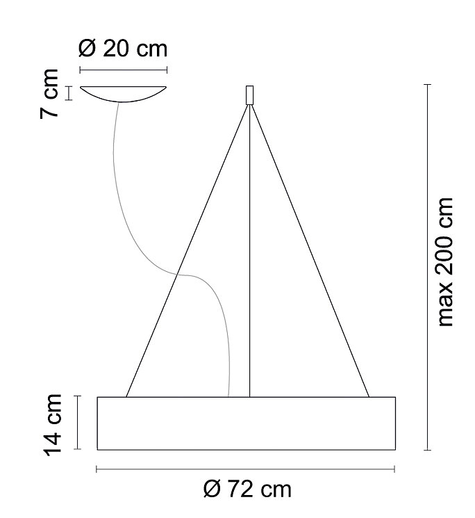 Suspension à lumière diffuse avec abat-jour circulaire en tissu et PVC auto-extinguible, structure en aluminium, diffuseur en polycarbonate opale, rosace de plafond avec driver intégré et circuit de 18W/mt et 180 LED/mt avec CRI>90.
