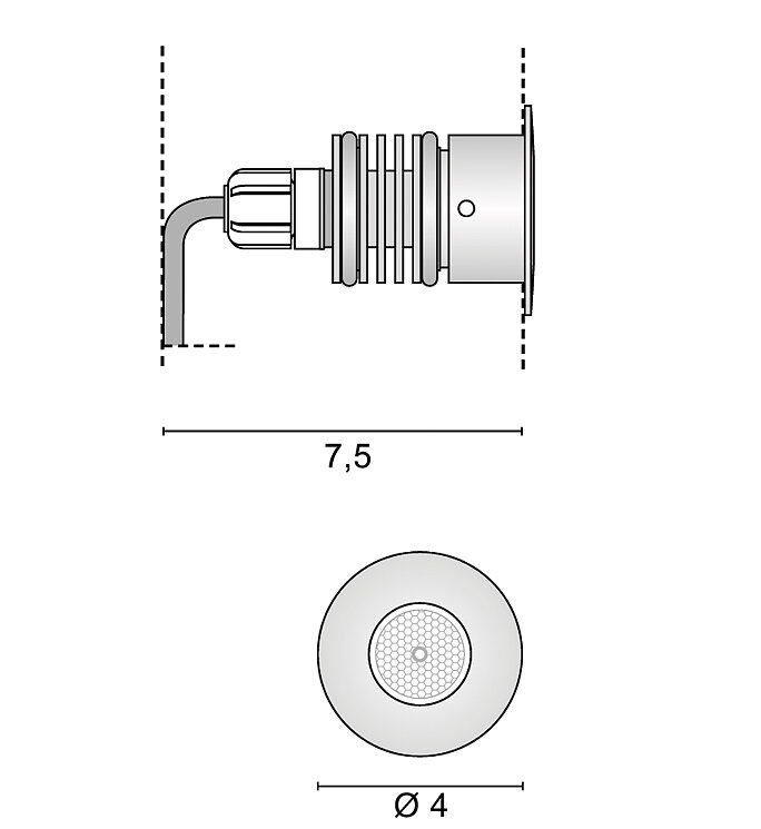 Downlight de passage IP67 avec source LED 500mA intégrée, bride en acier inoxydable AISI 316L, dissipateur thermique en aluminium, écran en verre, ouvertures optiques de 11°, 25° et 45° et câble en néoprène de 30 cm.