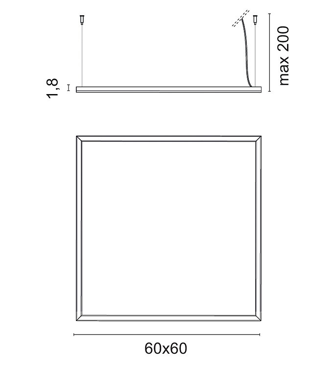 Suspension carrée à lumière diffuse avec circuit LED 24V, corps en aluminium et diffuseur en polycarbonate opalin.