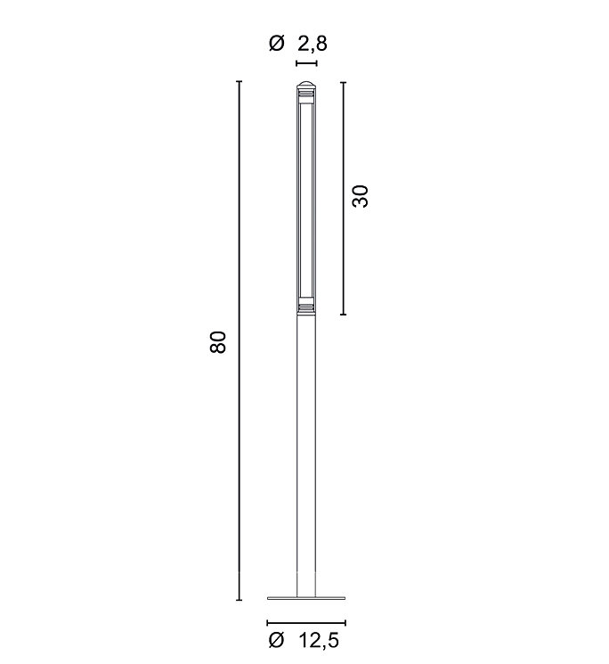 Lampadaire IP67 à lumière diffuse avec circuit LED intégré, structure en acier AISI 316L et diffuseur en méthacrylate transparent résistant aux UV.
