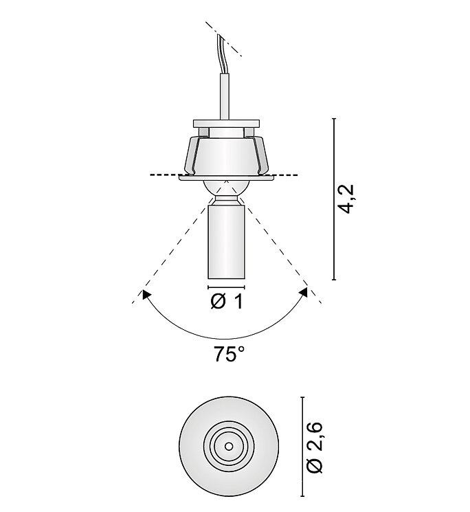 Micro projecteur encastré à lumière directe avec corps en aluminium chromé, source LED intégrée de 350mA et angle de rayonnement optique de 15°.