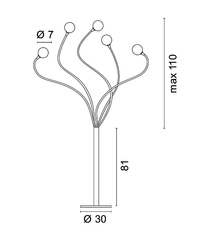 Lampadaire orientable à lumière diffuse avec LED intégrées, lampadaire en métal caractérisé par 5 bras flexibles en acier harmonique recouverts d'une gaine thermorétractable et d'un verre opale.