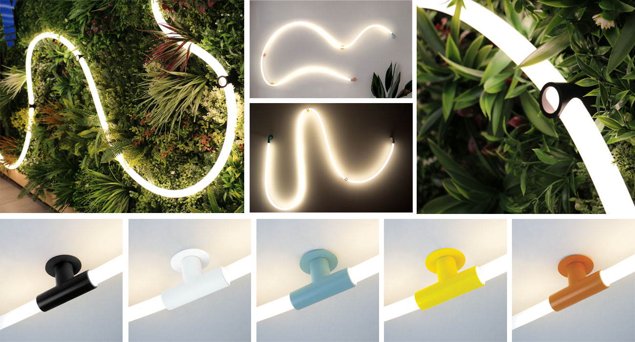 Un esempio particolare di utilizzo delle finiture colorate è il nuovo il sistema di illuminazione Anaconda. Questo innovativo sistema da parete, plafone e sospensione è caratterizzato dalla modellabilità del corpo tubolare in silicone e dalla luce diffusa e confortevole a 360 gradi.