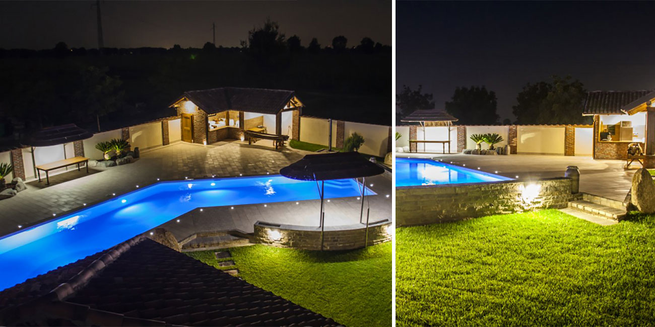 Aree piscina: aggiungete dei faretti intorno alla piscina per creare un ambiente suggestivo e invitante. Un’illuminazione soffusa intorno alla piscina può renderla un luogo ideale per un aperitivo serale, migliorando sia la sicurezza che la bellezza.