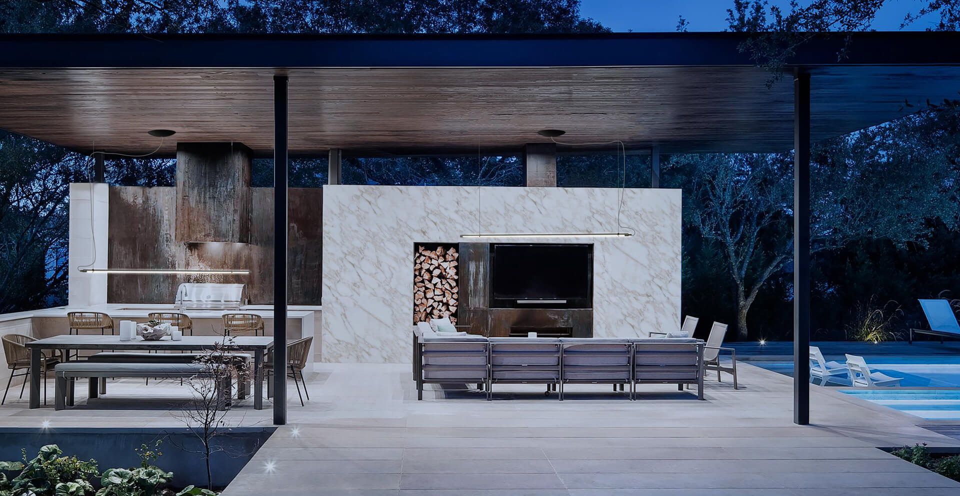Zone funzionali, come cucine outdoor, angoli pranzo o aree lounge, hanno bisogno di un mix di luce tecnica e atmosfera: luci a sospensione sotto una pergola, spot orientabili o strip LED a basso profilo sono ideali.
