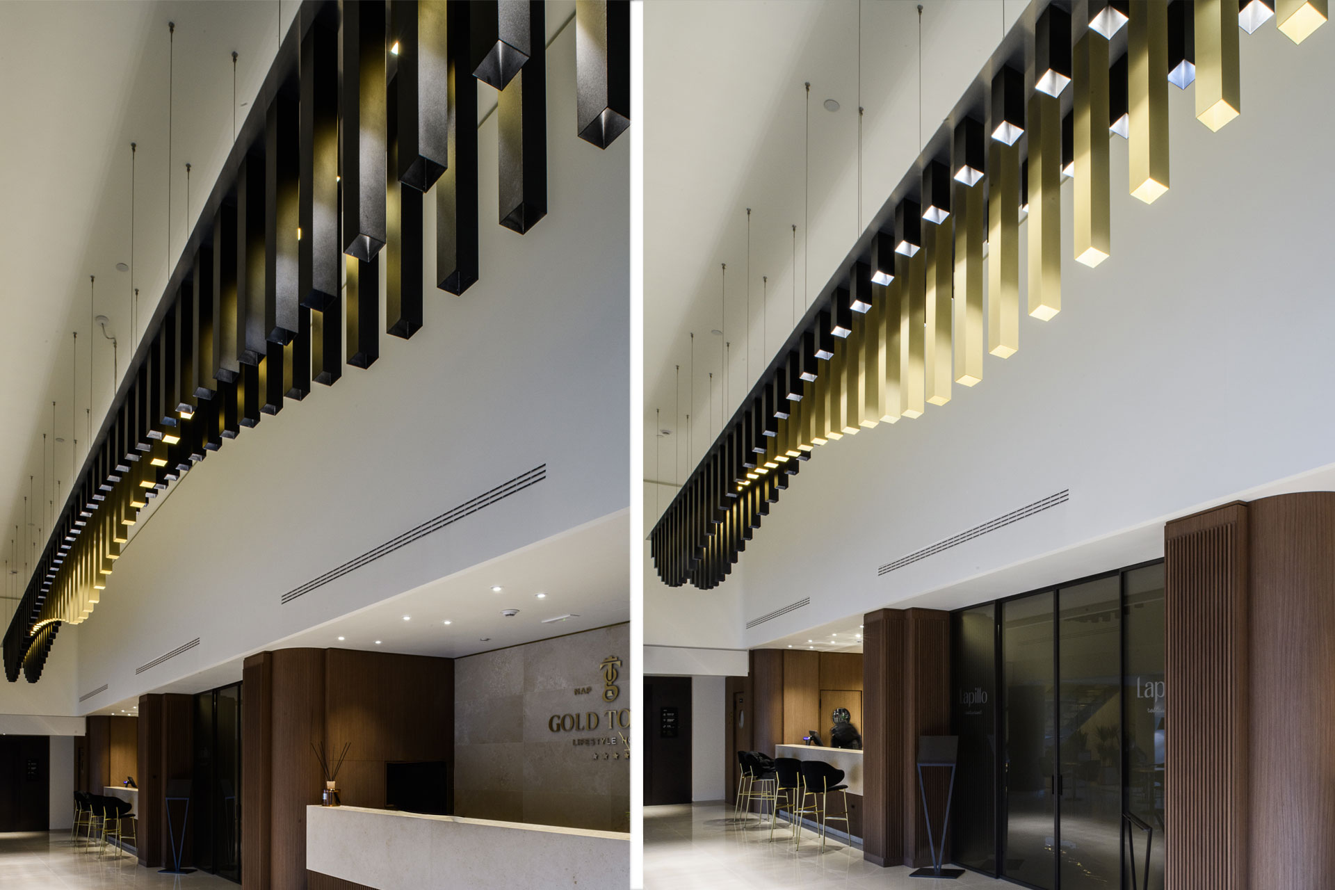 Gold Wave è il risultato della collaborazione tra officinadiarchitettura&design ed Egoluce, un dialogo creativo che ha dato vita a una sospensione capace di unire tecnologia, artigianalità e visione architettonica. L’obiettivo non era semplicemente illuminare, ma creare un’esperienza: un elemento scenografico che accoglie l’ospite, guida lo sguardo e trasforma la hall in un luogo speciale sin dal primo passo.