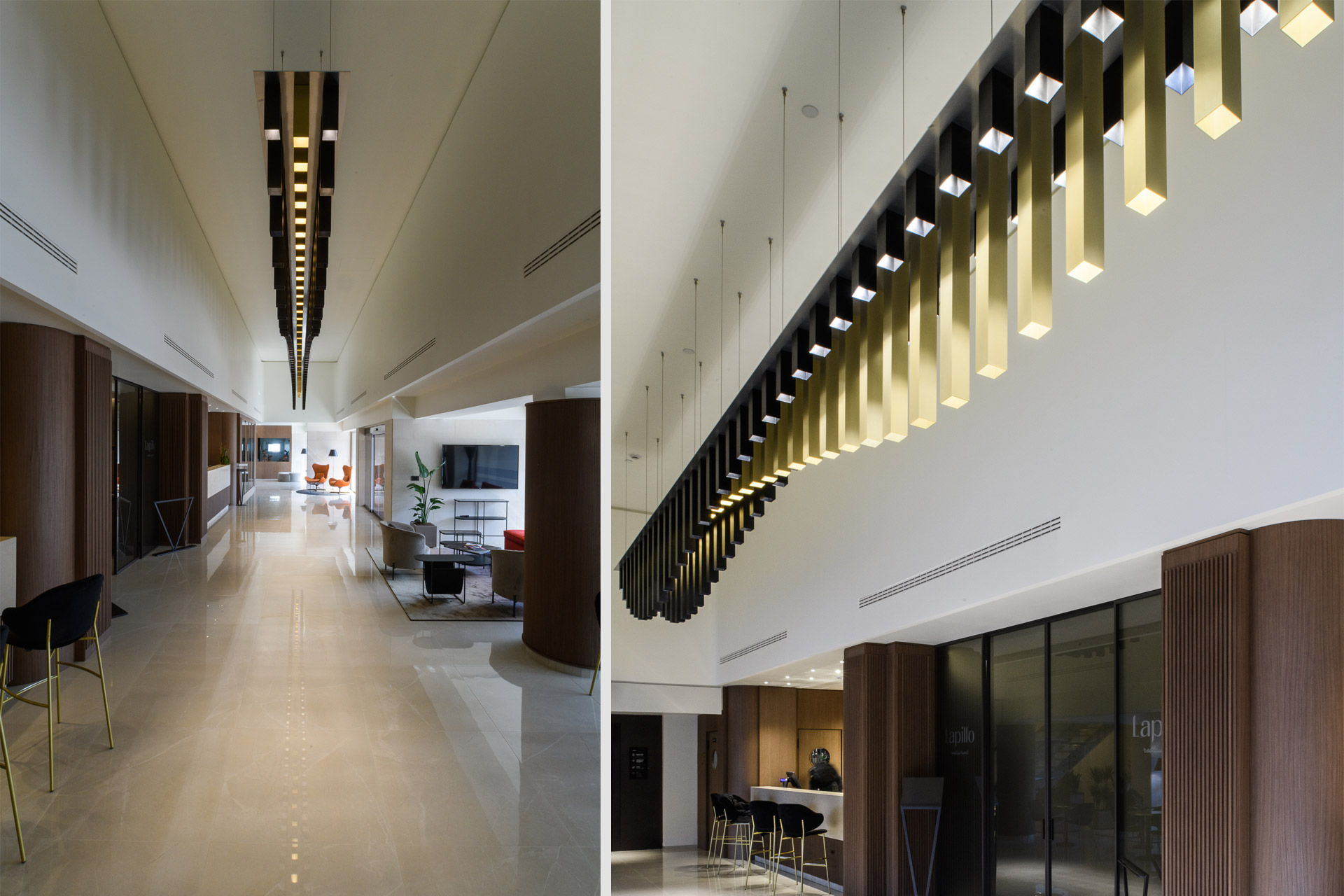La scelta delle lampade dipende sia dalla funzione dello spazio sia dalle caratteristiche architettoniche della lobby. In un ambiente che unisce estetica e funzionalità, l’approccio più efficace è quello di creare diversi livelli di illuminazione, combinando più tipologie di corpi illuminanti, ognuno con un ruolo specifico, così da ottenere un insieme equilibrato e armonico.
