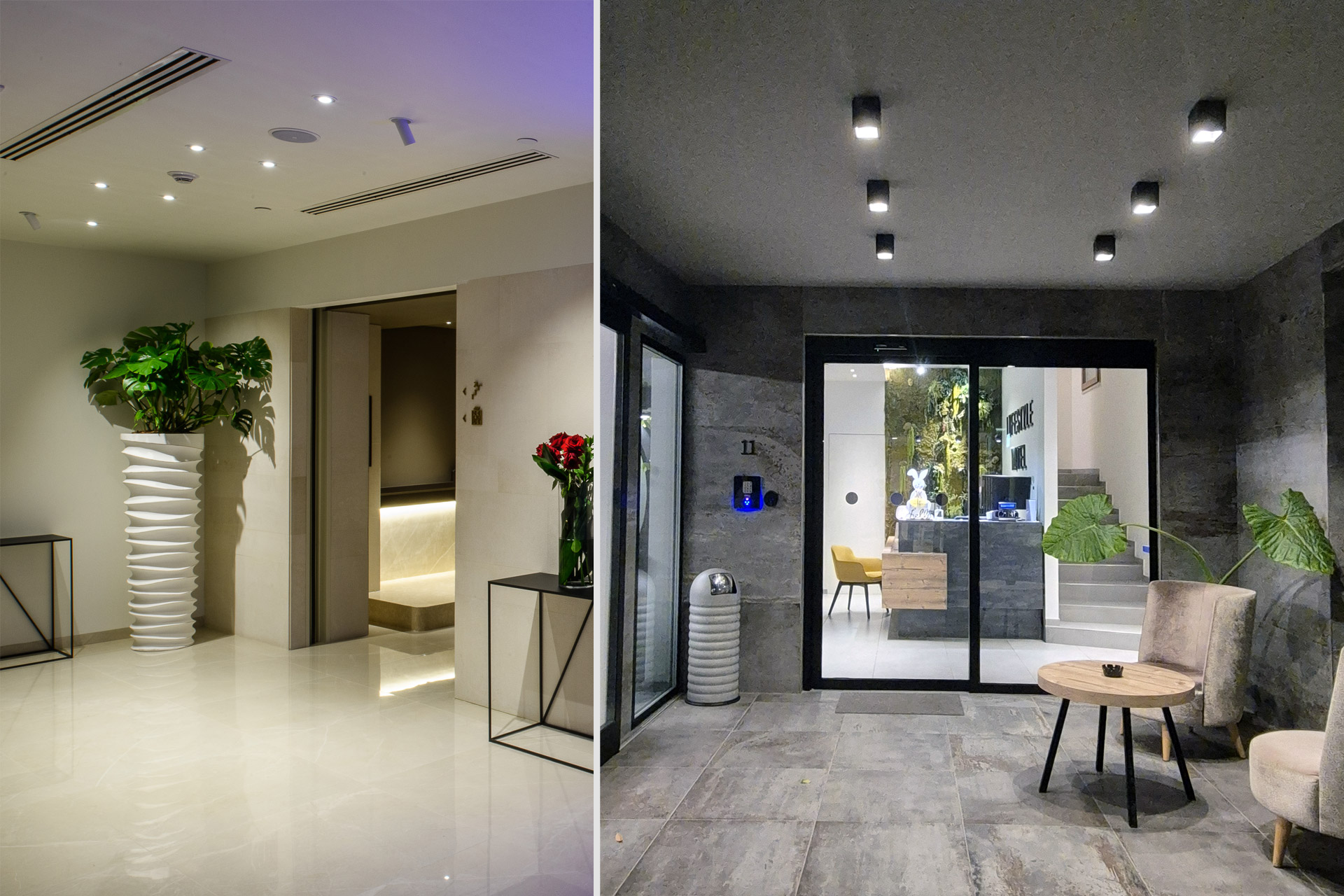 I faretti possono essere utilizzati come base per l’illuminazione generale, assicurano uniformità della luce e rendono lo spazio leggibile, evidenziando percorsi, aree di attesa e zone di distribuzione. La loro versatilità risiede nella possibilità di modulare l’ottica: fasci ampi garantiscono una corretta illuminazione nelle aree di passaggio, mentre spot più stretti permettono di mettere in risalto dettagli architettonici o elementi decorativi come opere d’arte e materiali pregiati. Dal punto di vista tecnico, apparecchi con UGR < 19 riducono il rischio di abbagliamento, garantendo un comfort visivo adeguato a spazi di rappresentanza come la hall
