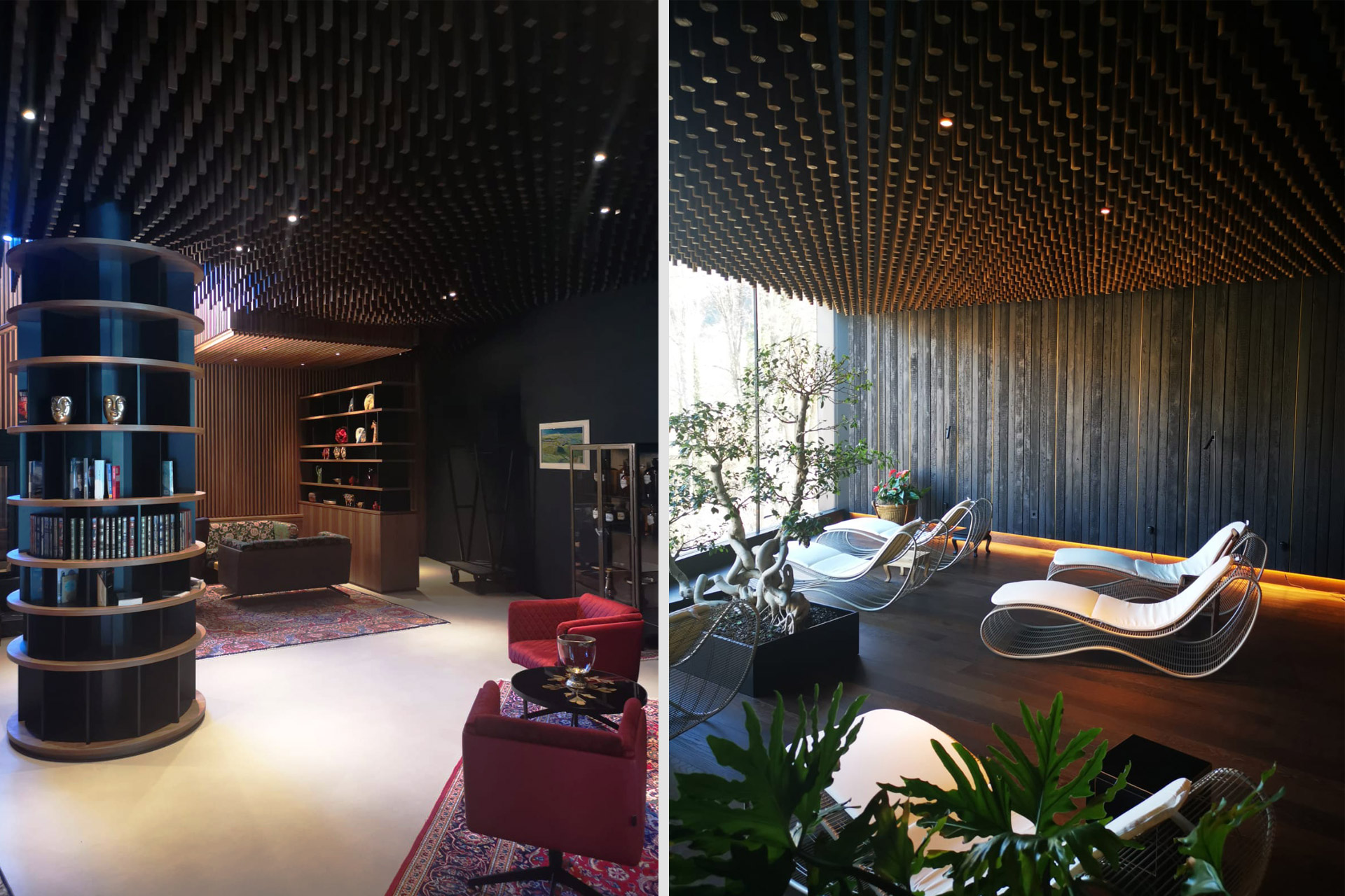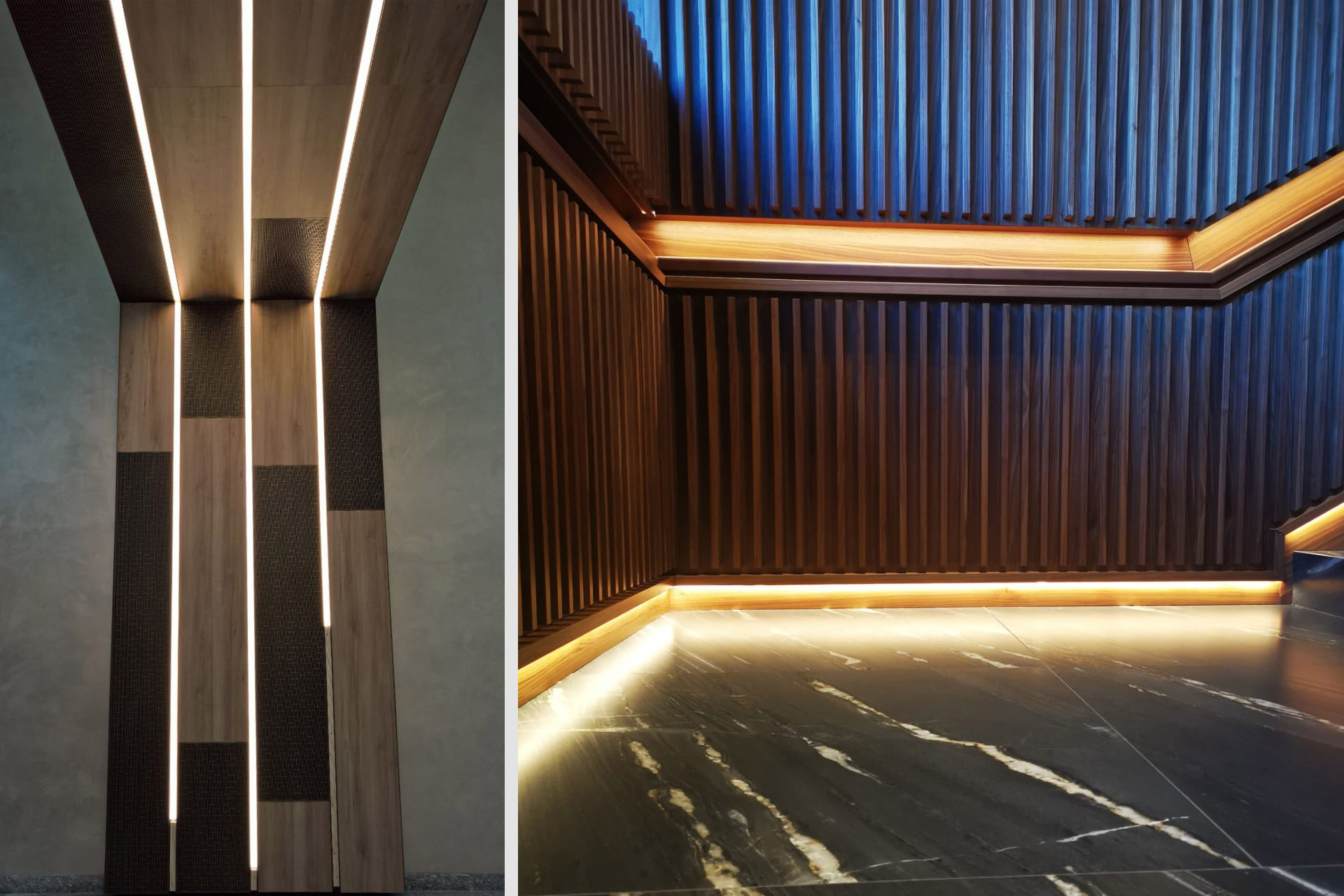 Un esempio significativo è la lobby del Gold Tower Hotel di Napoli, dove, in collaborazione con l’architetto Antonio Brancaccio, è nata la composizione “Gold Wave”: una doppia onda luminosa realizzata con lampade Egokube di lunghezze differenti, disposte su tre linee parallele. La forma fluida della struttura rompe la linearità dello spazio e ne amplifica la percezione, mentre le finiture in nero e foglia oro dialogano con il concept principale dell’hotel, conferendo eleganza e profondità visiva.