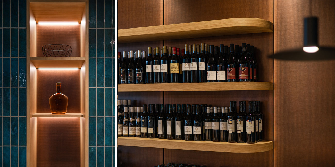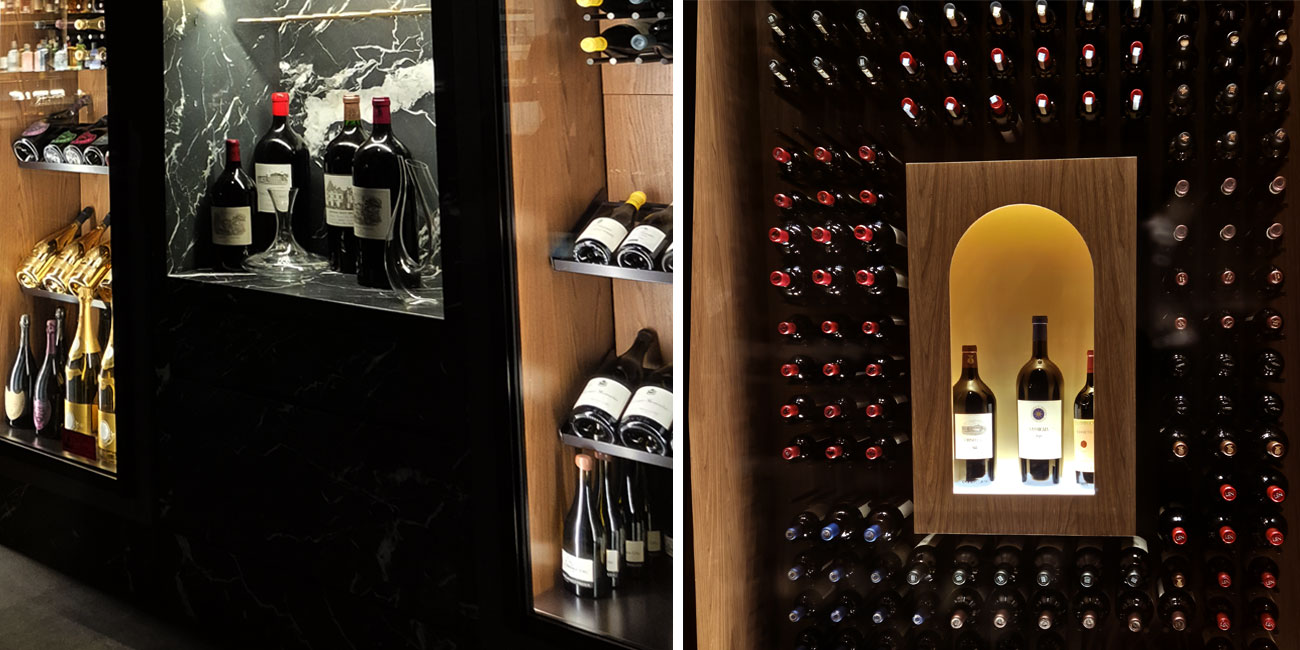 L’illuminazione di accento, invece, ha lo scopo di valorizzare le bottiglie, sottolineandone i dettagli senza alterarne il contenuto. Illuminazione progettata per una luce puntuale e uniforme permette di enfatizzare la texture del vetro e il design delle etichette, esaltando la profondità cromatica del vino senza comprometterne la conservazione. Il montaggio diretto in prossimità degli espositori garantisce un’illuminazione mirata che mette in risalto ogni bottiglia, mantenendo un equilibrio visivo armonioso all’interno della cantina. Inoltre, l’utilizzo di LED ambra assicura una resa luminosa ottimale, capace di valorizzare i dettagli senza alterare la qualità del vino, contribuendo così a un’esperienza sensoriale raffinata e coinvolgente.