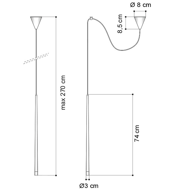 Lampada a sospensione a luce diretta e puntuale con corpo in tubo di metallo conificato con testa in alluminio, lente interna in metacrilato con apertura di 40°, rosone con driver integrato e con cavo di alimentazione trasparente di 200 cm.