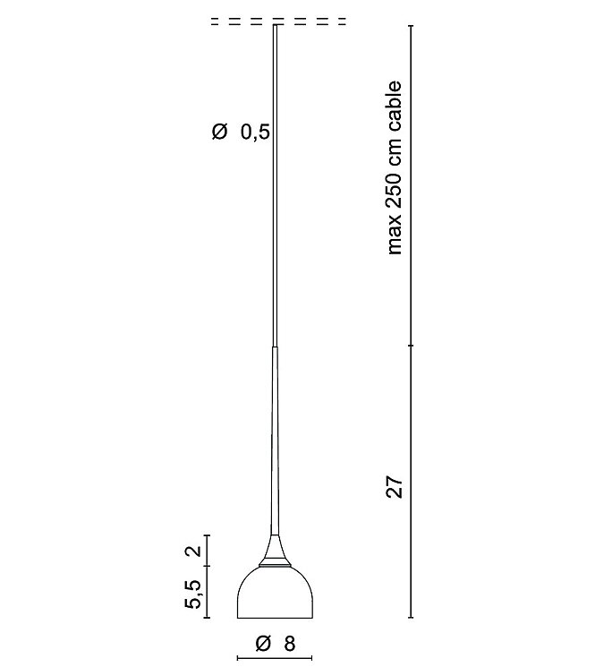 Sistema di piccole lampade a sospensione a luce diretta con sorgente LED integrata a 350mA, corpo in alluminio, diffusori in metallo stampato e cavo coassiale di 250 cm.