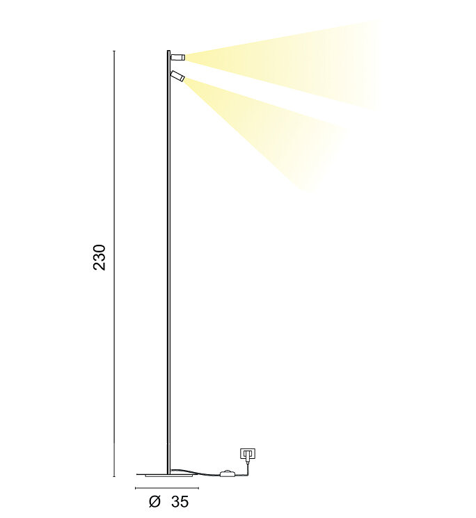 Il lungo ed esile stelo, che raggiunge i 2,30 metri di altezza, consente di orientare i due proiettori per illuminare puntualmente i nostri oggetti. La grande base piatta fornisce alla lampada l’adeguata stabilità e la scelta dei materiali la rendono facilmente movibile.