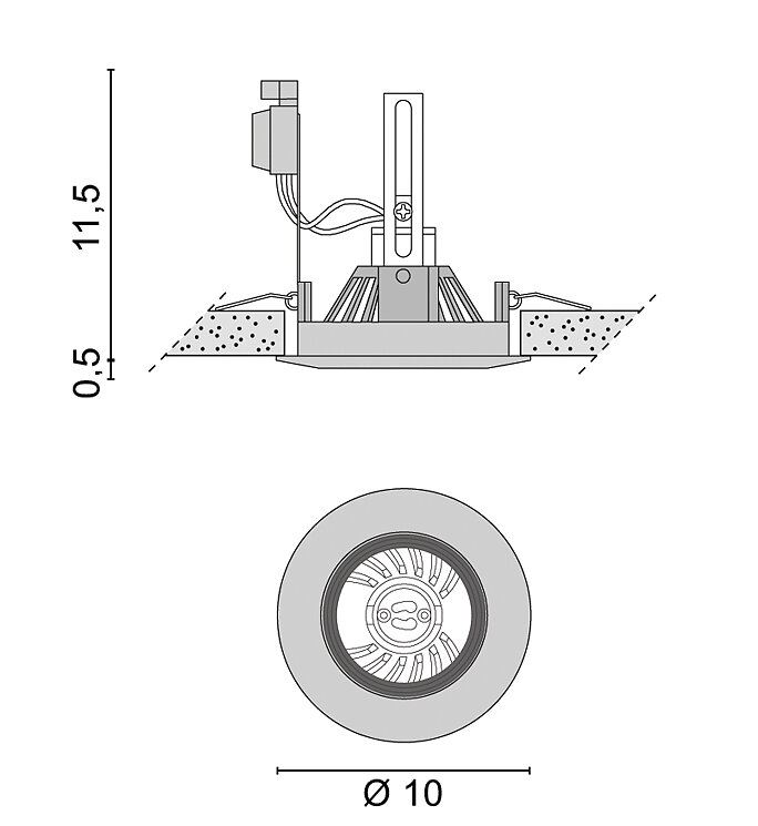 Faretto da incasso a luce diretta con struttura in pressofusione di alluminio e portalampada con attacco GU10.