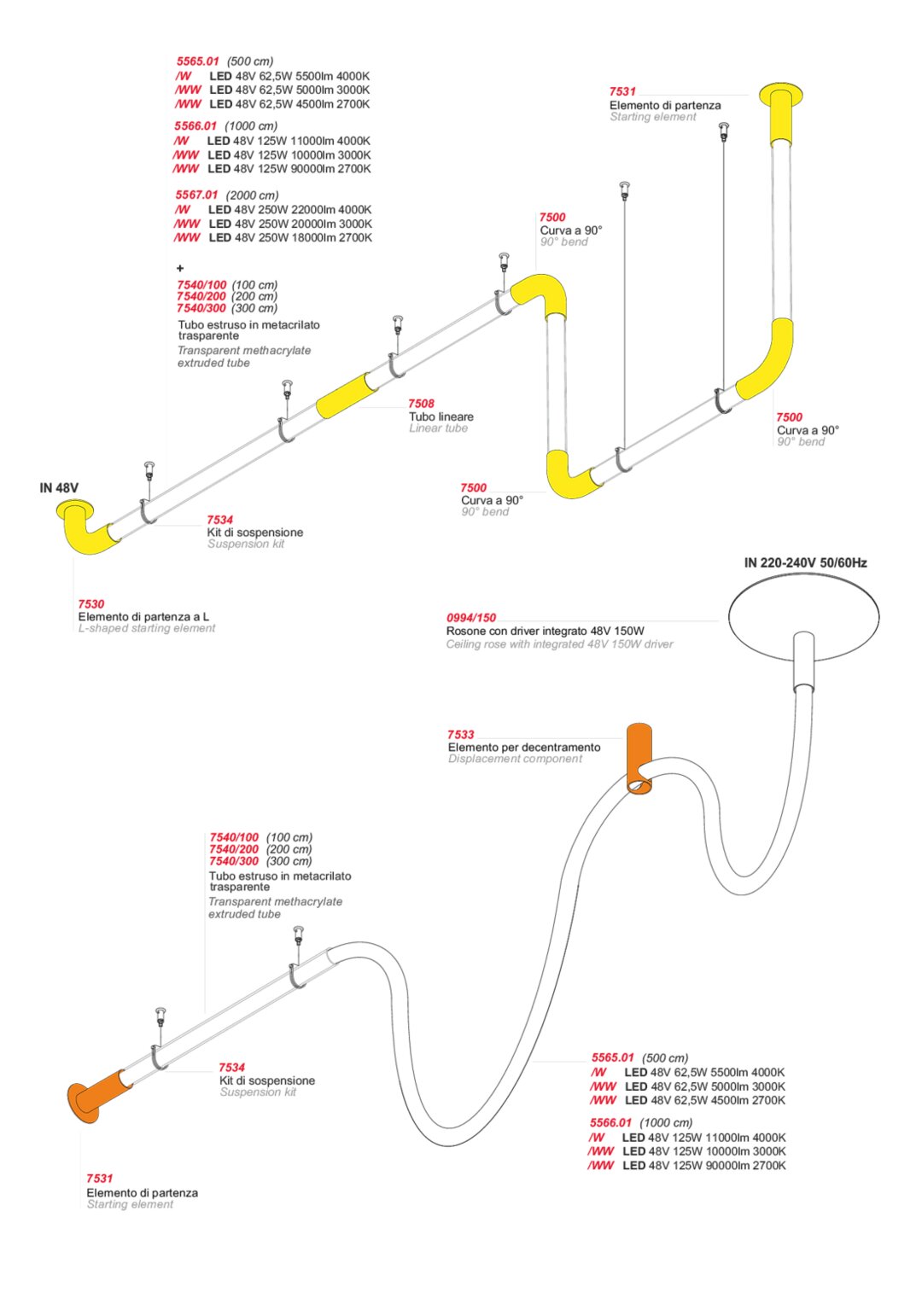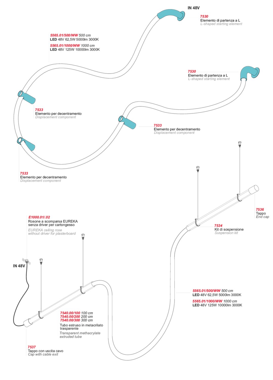 Подвесная, настенная и потолочная система освещения с 48-вольтовым светодиодным контуром, отличающаяся гибкостью гибкого силиконового трубчатого корпуса и 360-градусным рассеиванием света.