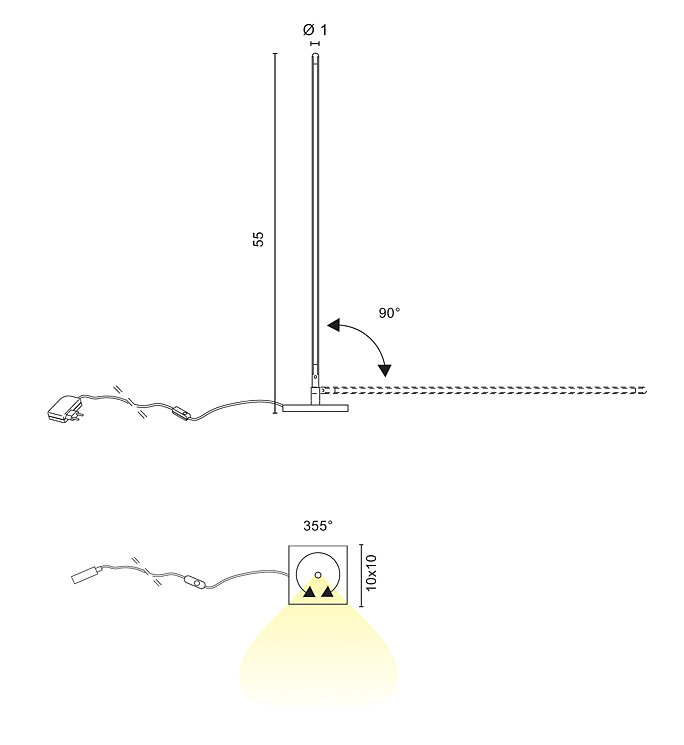 Регулируемая и диммируемая настольная лампа рассеянного света, характеризующаяся тонким профилем из черного экструдированного алюминия, опаловым поликарбонатным рассеивателем, микросхемой 12,5 Вт/м и 203 светодиодами/м с CRI>90, металлическим основанием и кнопкой диммирования на кабеле.