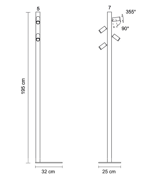 Напольный светильник с корпусом из алюминия и металла, оснащенный 4 регулируемыми прожекторами с прямым светом COB-светодиодов с CRI>90 и оптическими апертурами 24°, 38° и 58°. Передняя стеклянная линза прожекторов может быть прозрачной или матовой (/ST).