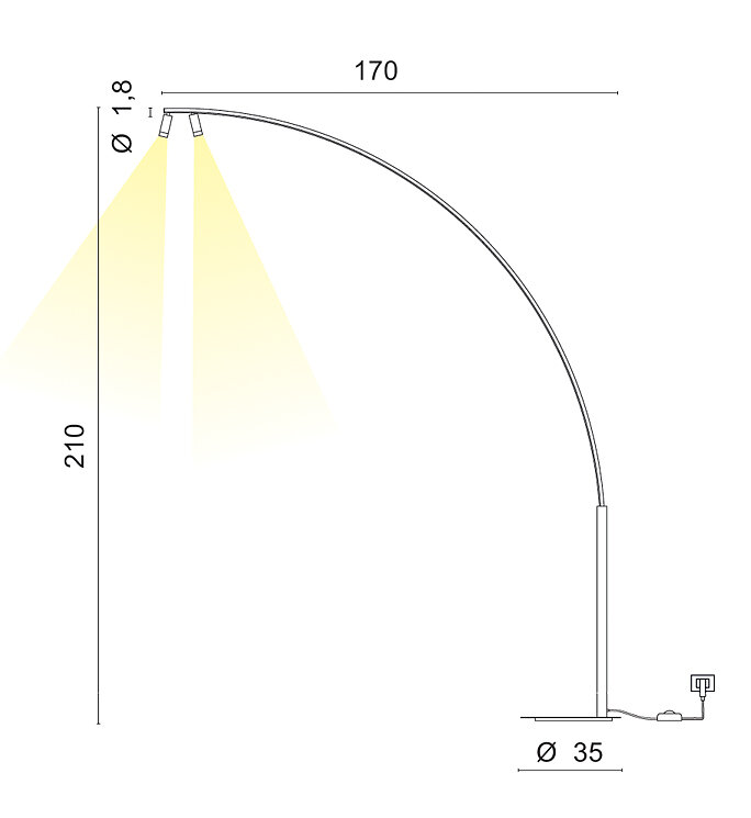 Большая тонкая дуга высотой 2,10 метра позволяет разместить оба прожектора в центре стола или над диванным креслом. Большое плоское основание обеспечивает лампе достаточную устойчивость, а выбор материалов позволяет легко перемещать ее.