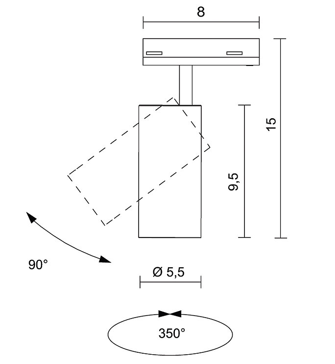 Однофазный трековый регулируемый прожектор прямого света 230 В с алюминиевым корпусом, металлическим основанием и патроном для лампы GU10.