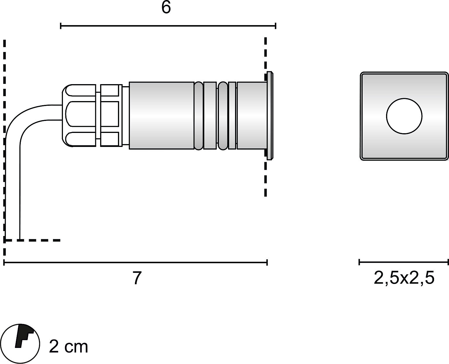 Мини-прожектор IP67 со встроенным светодиодным источником 350 мА, квадратным фланцем из нержавеющей стали AISI 316L, стеклянным экраном, оптическими апертурами 11°, 25° или 45°, алюминиевым радиатором и неопреновым кабелем 30 см.