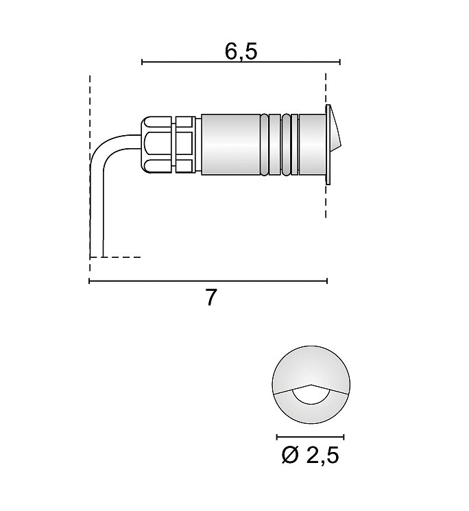Прогулочный микропрожектор IP67 со встроенным светодиодным источником 350 мА, фланцем с антибликовой крышкой из нержавеющей стали AISI 316L, алюминиевым теплоотводом и неопреновым кабелем 30 см.