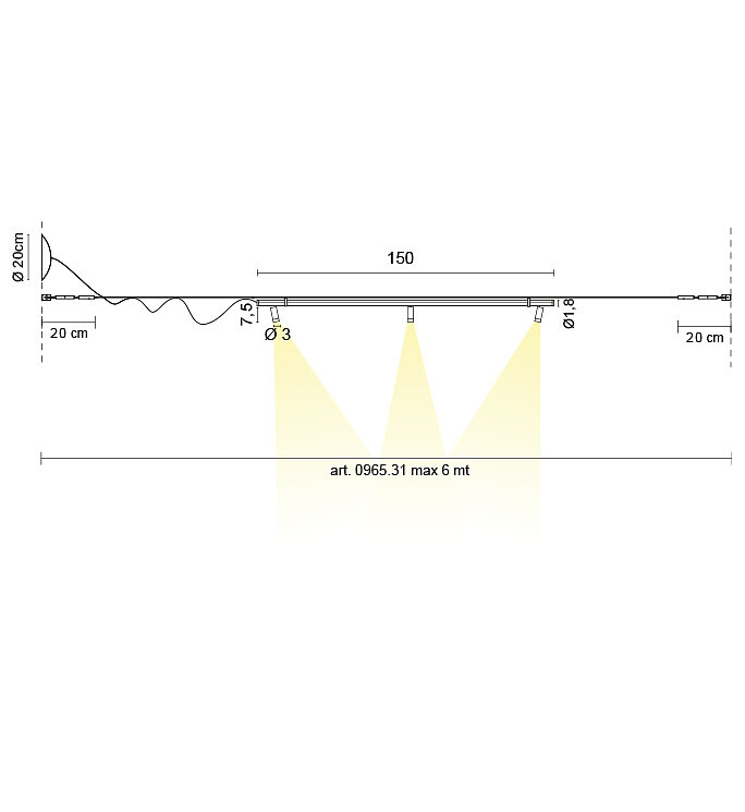 Подвесной светильник прямого света, передвижной на стальном тросе, с алюминиевым корпусом, тремя регулируемыми мини-прожекторами со встроенным светодиодным источником с CRI>90, оптической апертурой 48° и потолочной розой со встроенным драйвером для включения/выключения.